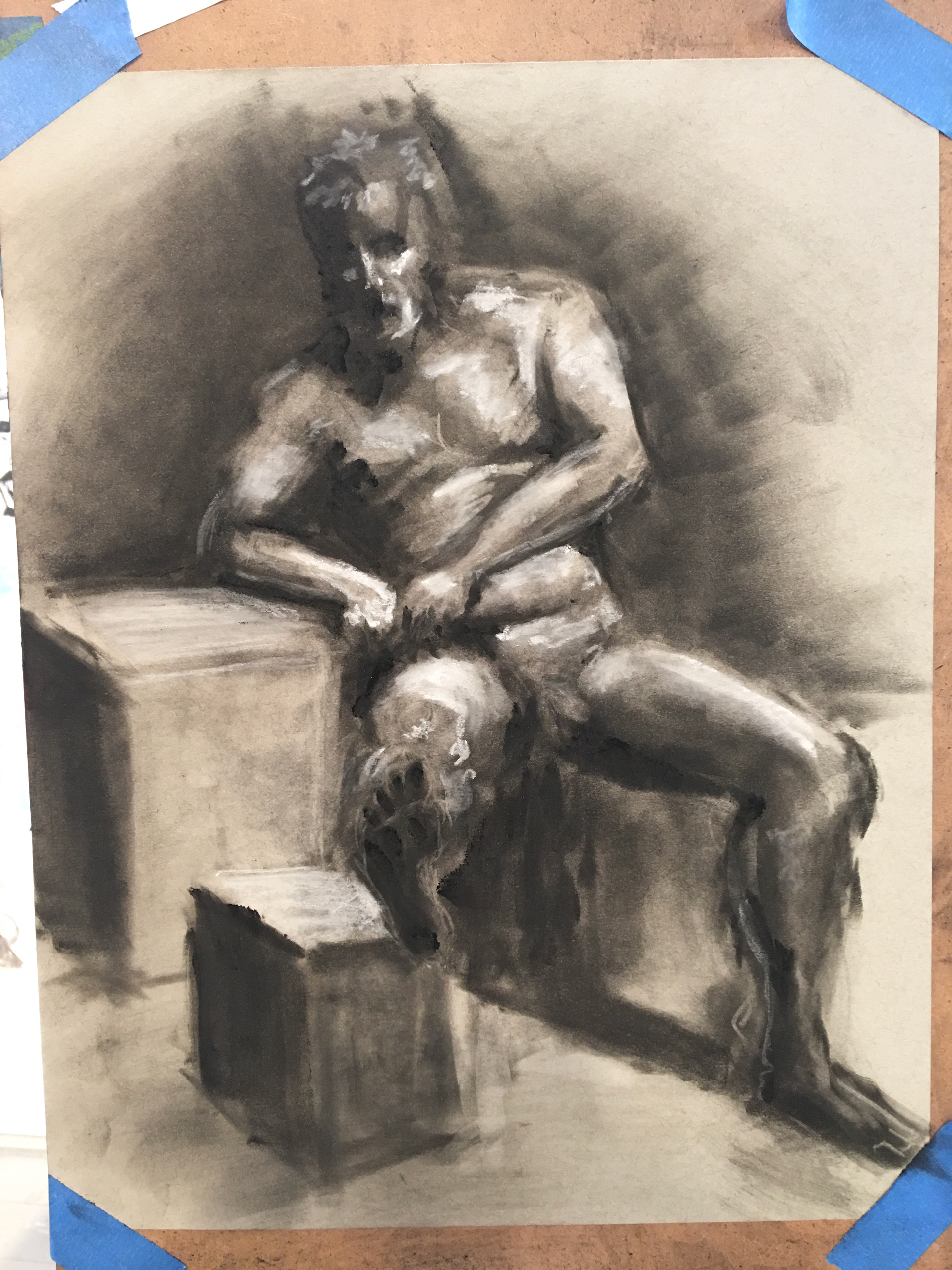Figure Drawing with pan pastel. I decided to leave the photo raw because I thought the tape and the board added some fun