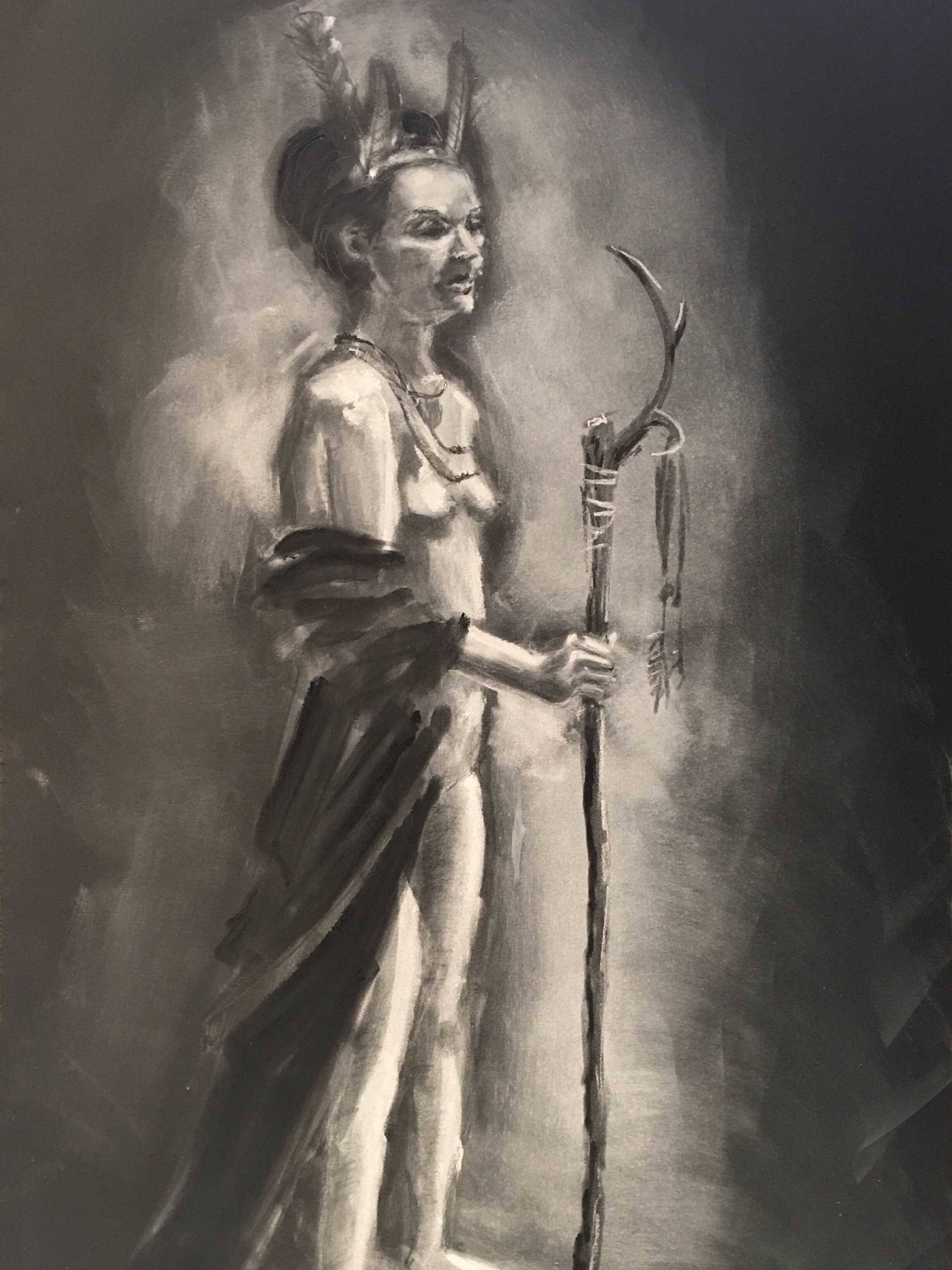 Woman with headdress and staff. Pan pastel and charcoal pencil.